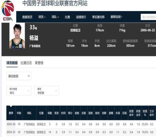 目前,杨溢是CBA二年级生,然而,在杜锋的麾下,杨溢完全被游离在广东队的体系之外,上赛季,他一共出场14场比赛,场均出场时间只有5.9分钟,只能交出1.1分0.9篮板0.9助攻的数据。本赛季,杨溢的出场时间更加惨淡,一共只打了5场比赛,场均出场时间为5.8分钟,交出1分0.6篮板04助攻。