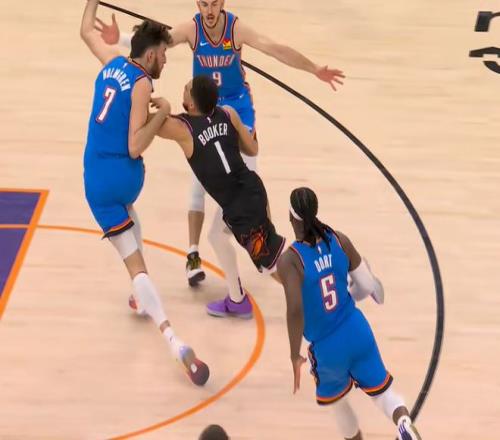 第四节决战,布克突破中手肘打到霍姆格伦,裁判回看后判罚后者防守犯规。亚历山大突击连续2次穿越包夹,高抛命中后坐地摊手想要加罚,裁判也是不给,但雷霆依旧维持10分左右领先,最终,雷霆131-122横扫太阳,成为首轮首组晋级的球队。
