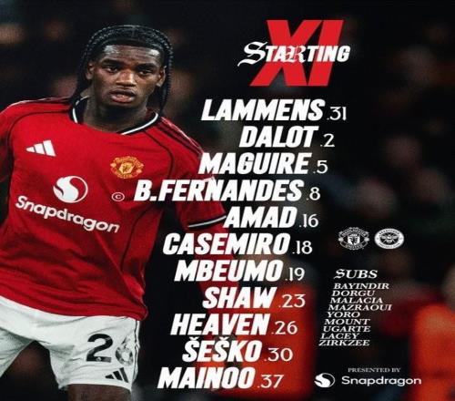 曼联首发:31-拉门斯、2-达洛特、5-马奎尔、26-海文、23-卢克-肖、37-梅努、 8-B费、16-阿马德-迪亚洛、18-卡塞米罗、19-姆伯莫、30-谢什科
