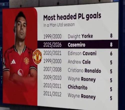 数据显示,这是卡塞米罗本赛季第8次用头得分,他的9粒进球只有一个不是头球。这已经追平了曼联队史单赛季头球破门纪录,与1999/2000赛季的约克持平。
